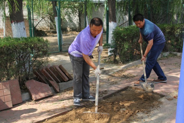 6月15日,郭強(qiáng)、段建平等幾名老同志主動到職工菜地勞動,為菜地除草、澆水。當(dāng)發(fā)現(xiàn)菜地一角堆積了一些廢舊磚塊時,幾名老大哥一商量,干脆廢物利用,用這些磚塊為職工鋪一條采摘小路,大家紛紛表示贊同并積極加入勞動隊(duì)伍。小路修好后,干勁高漲的人們又一鼓作氣對“鼓包”的方磚路面進(jìn)行了修整。